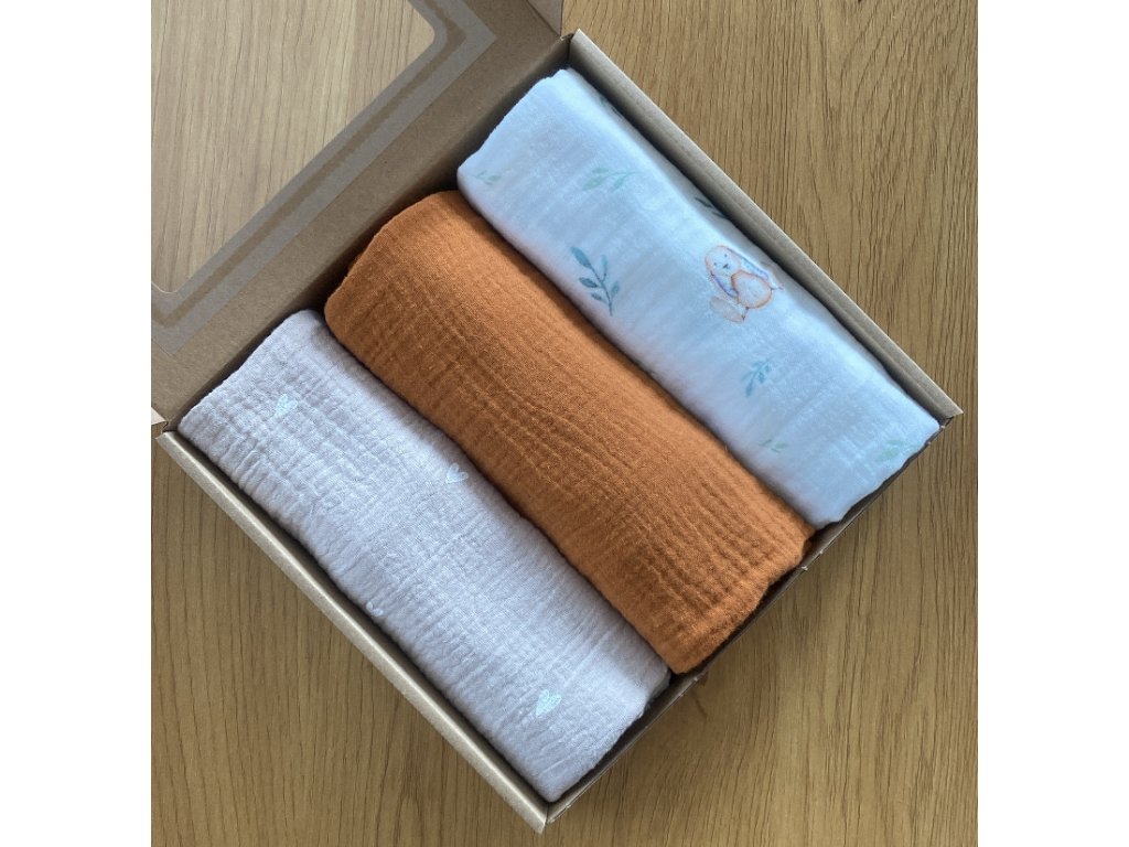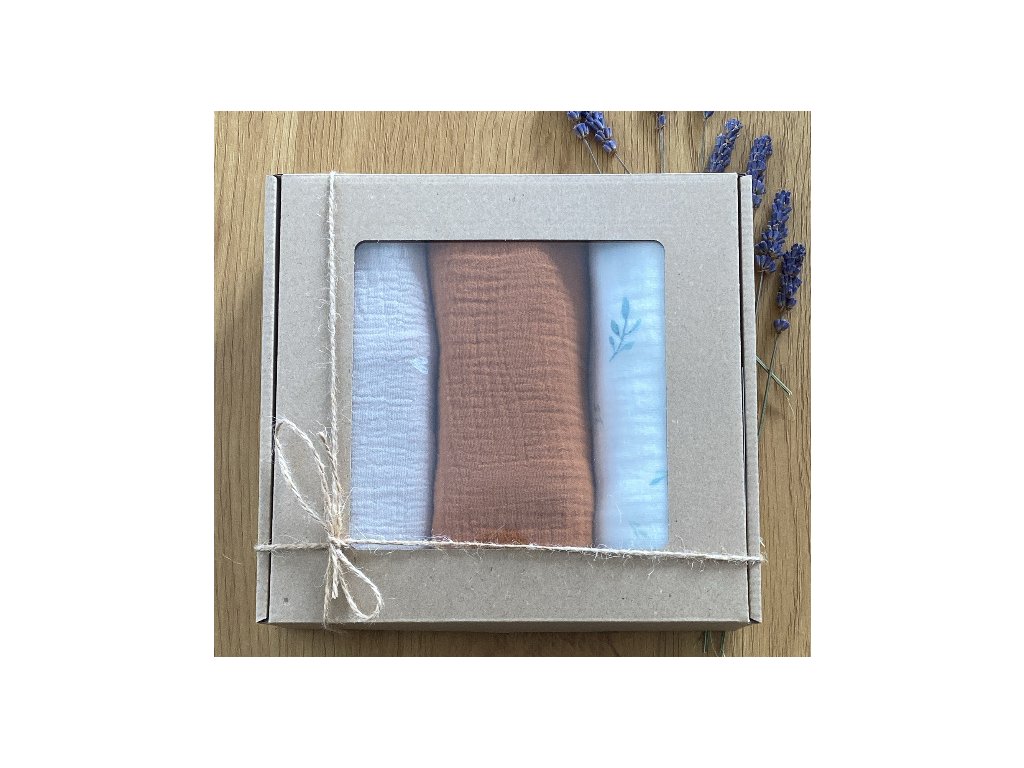 Nabízíme Vám již sestavenou dárkovou krabičku našich mušelínových plen.