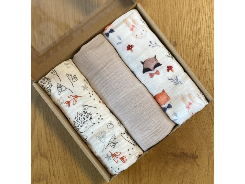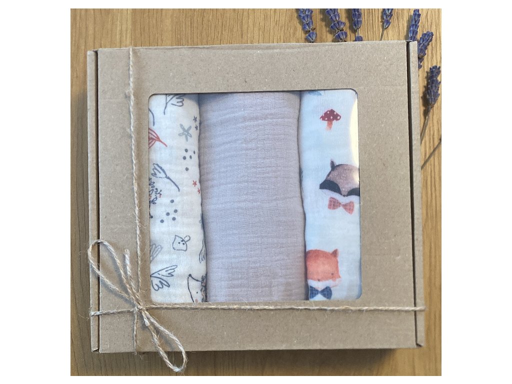 Nabízíme Vám již sestavenou dárkovou krabičku našich mušelínových plen.