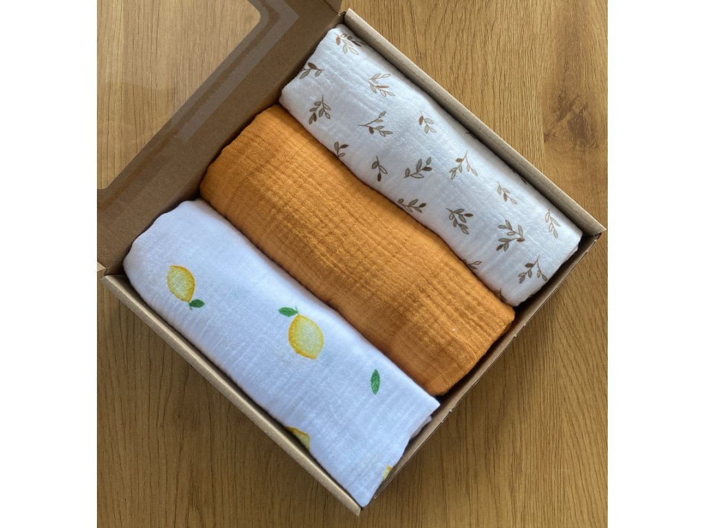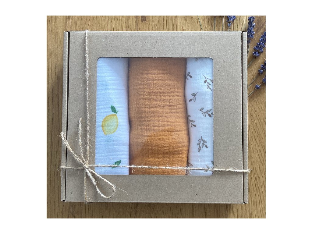Nabízíme Vám již sestavenou dárkovou krabičku našich mušelínových plen.