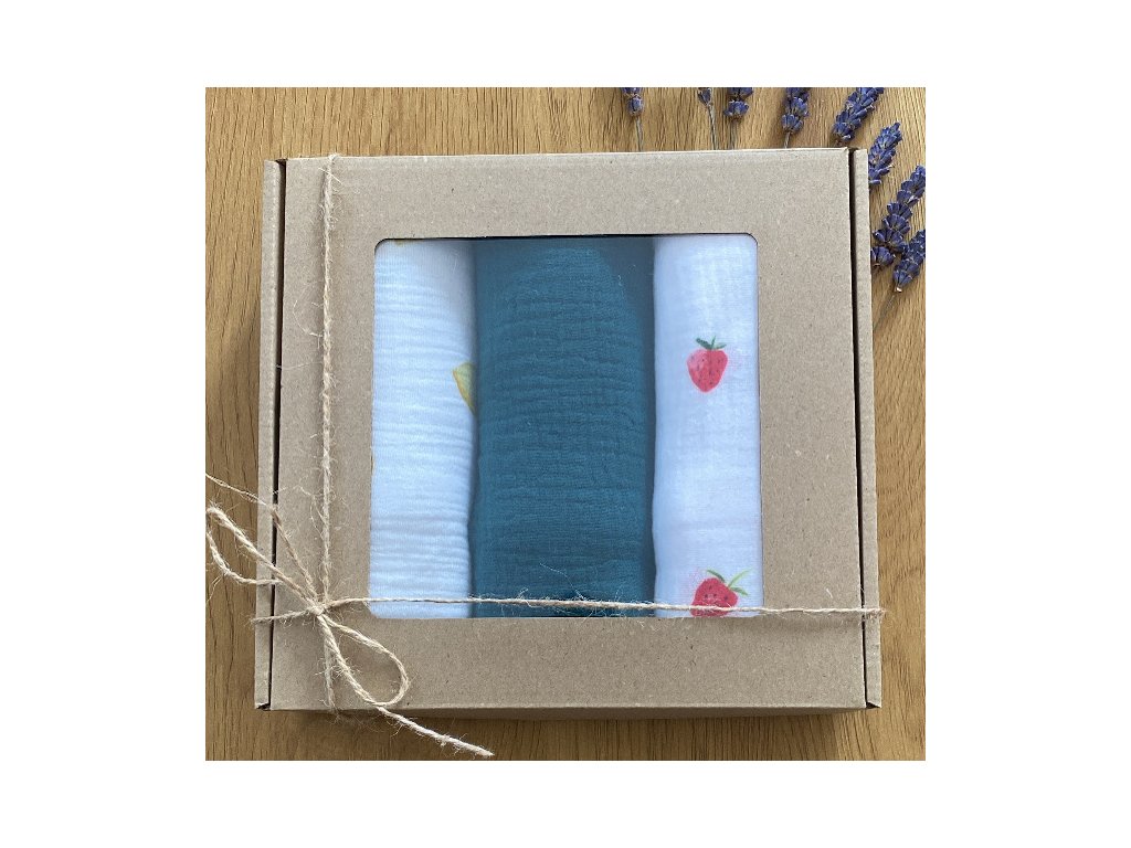 Nabízíme Vám již sestavenou dárkovou krabičku našich mušelínových plen.