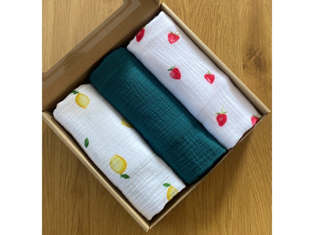 Mušelínové pleny 70 x 70 cm: citrónky, petrolej, jahody.