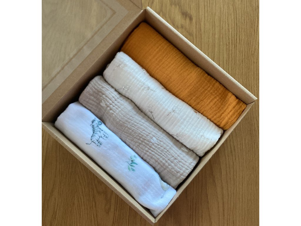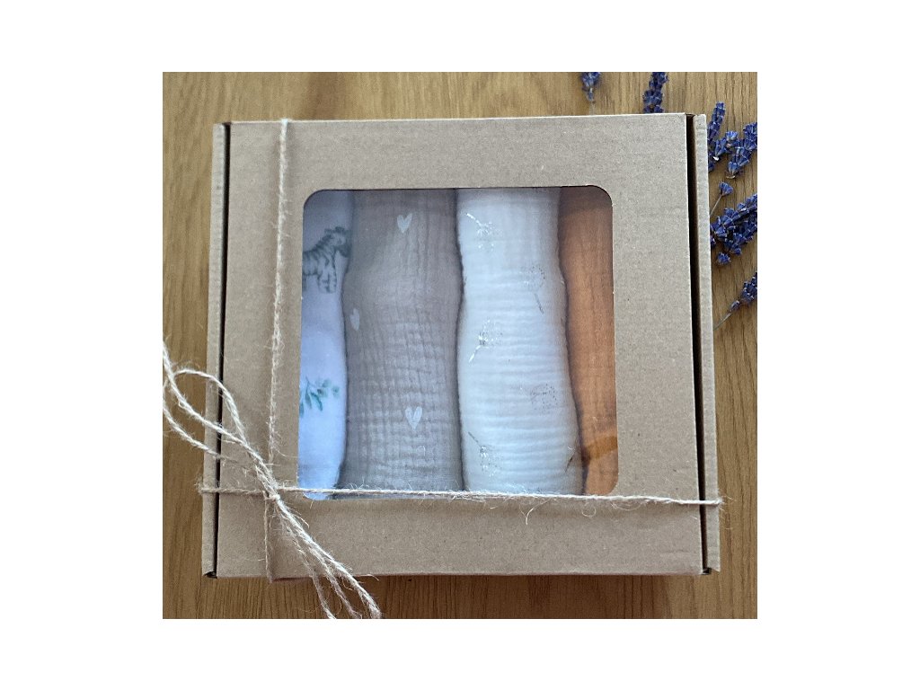 Nabízíme Vám již sestavenou dárkovou krabičku našich mušelínových plen.