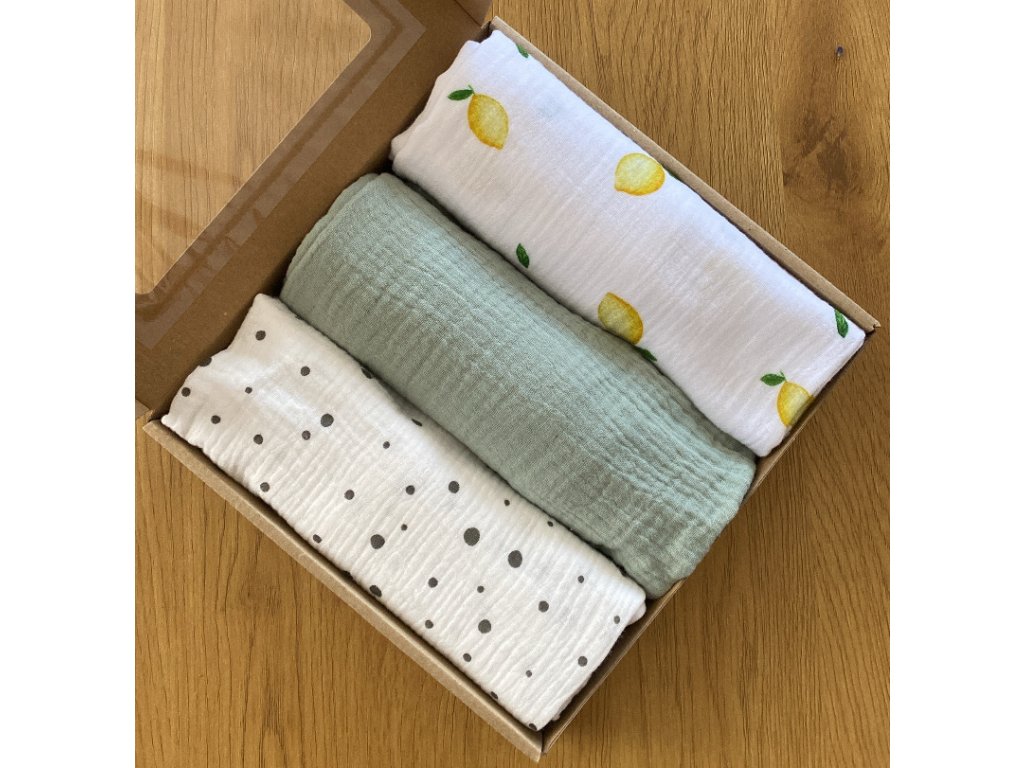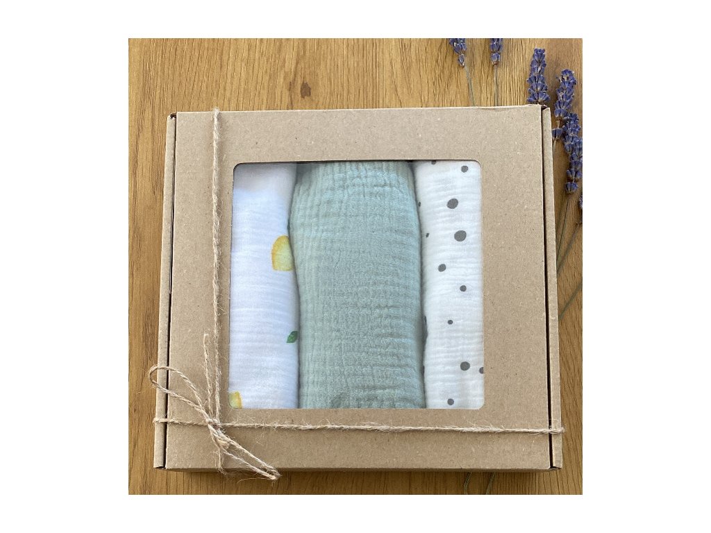 Nabízíme Vám již sestavenou dárkovou krabičku našich mušelínových plen.