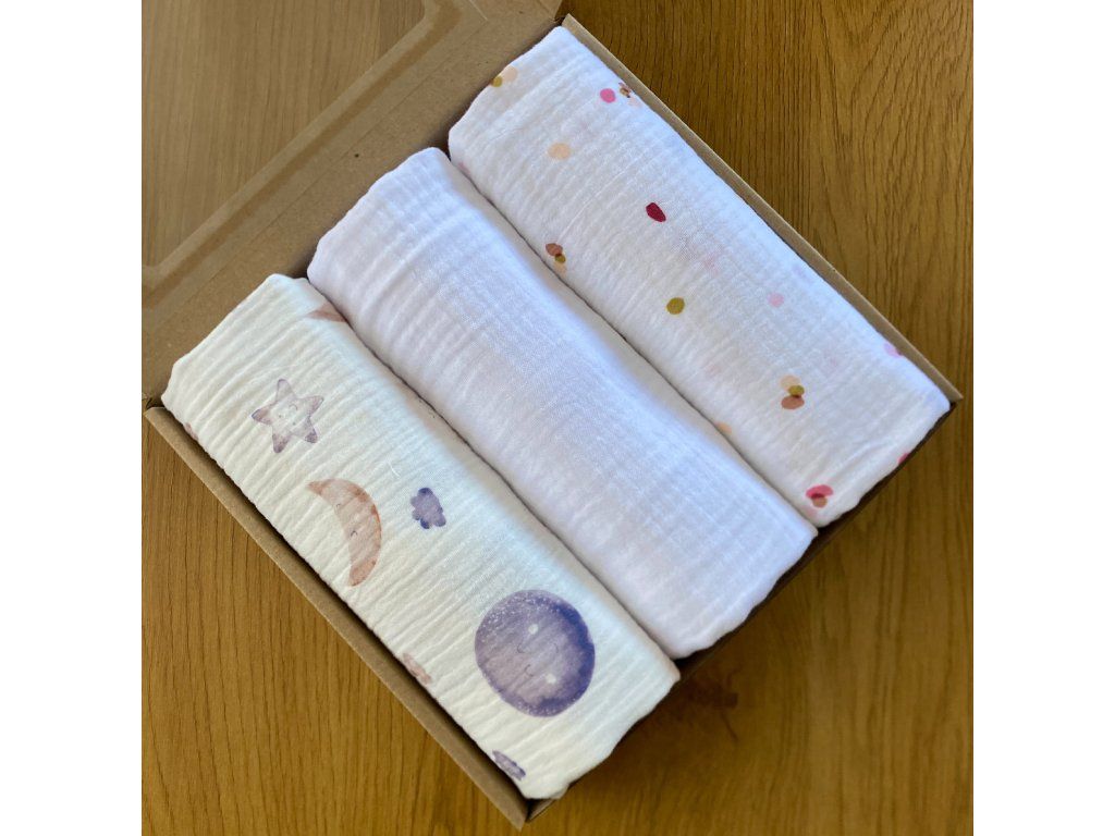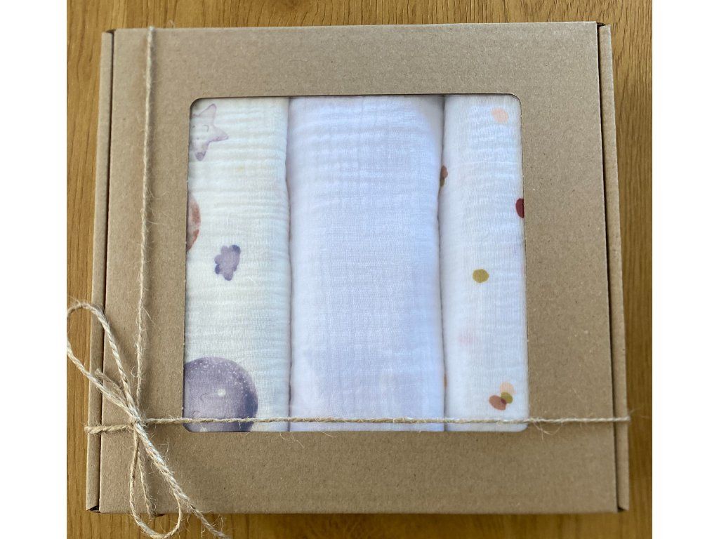 Mušelínové pleny 70 x 70 cm: měsíc, bílá, barevné tečky.