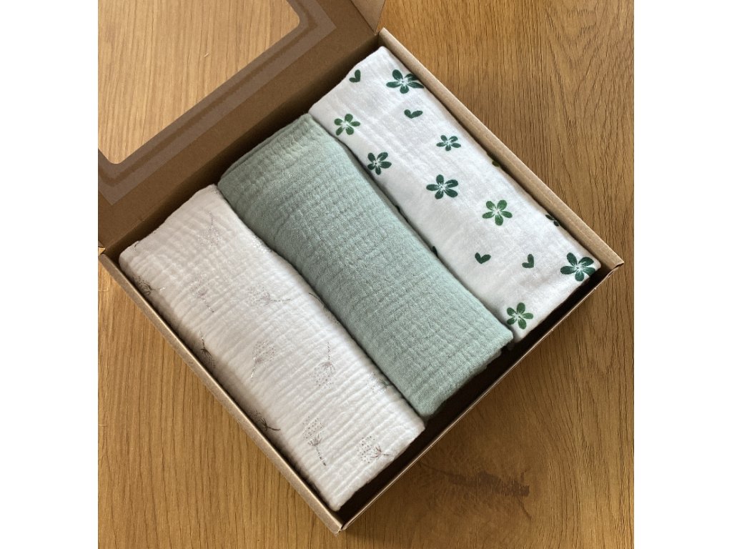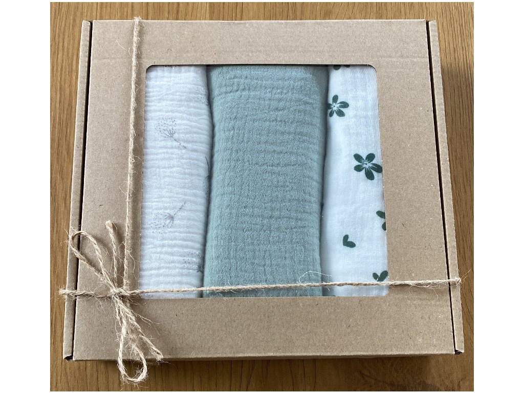 Nabízíme Vám již sestavenou dárkovou krabičku našich mušelínových plen.