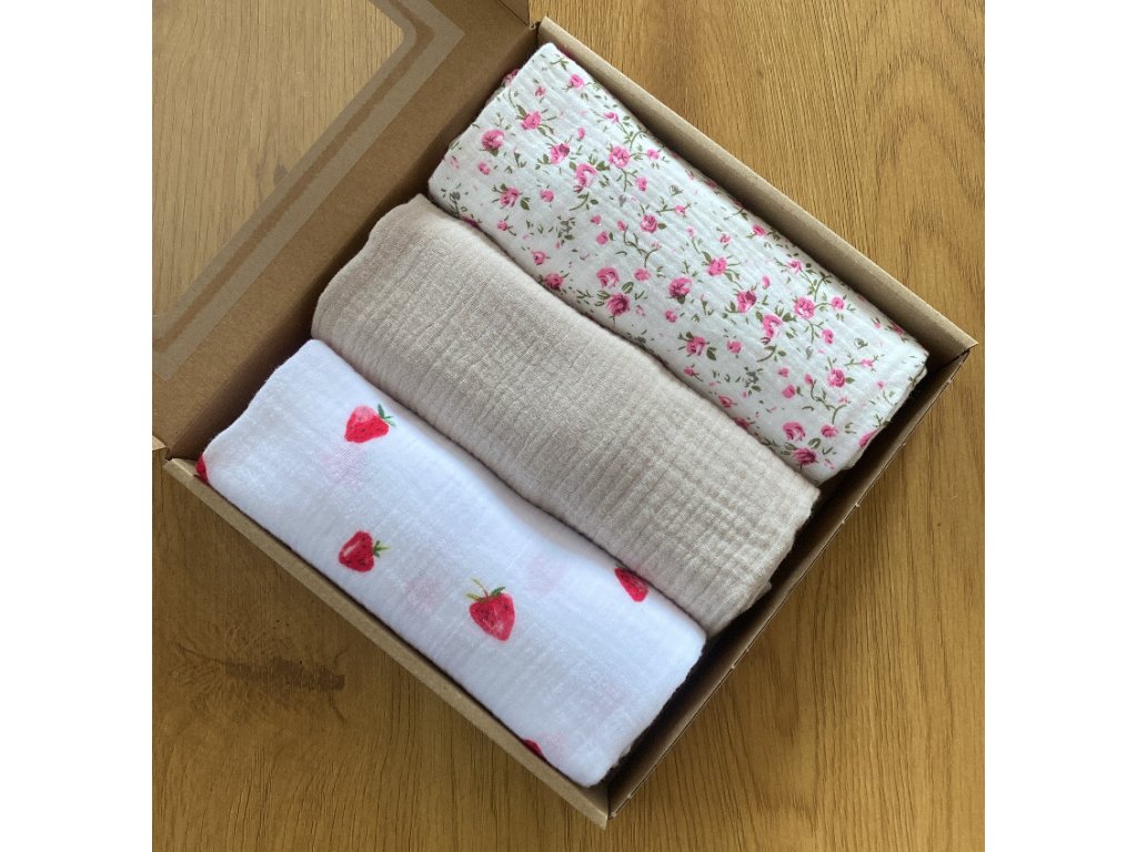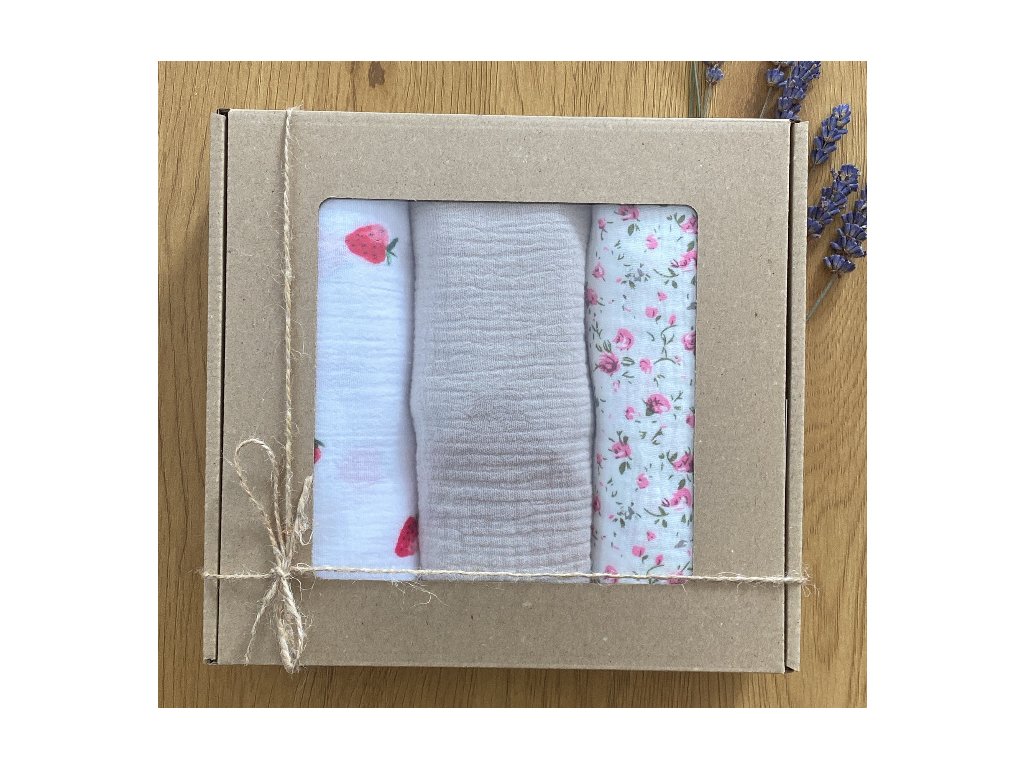 Nabízíme Vám již sestavenou dárkovou krabičku našich mušelínových plen.