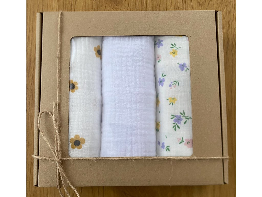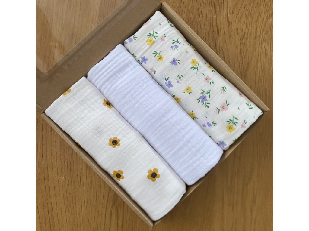 Mušelínové pleny 70 x 70 cm: žluté kvítky, bílá, žluté květy.