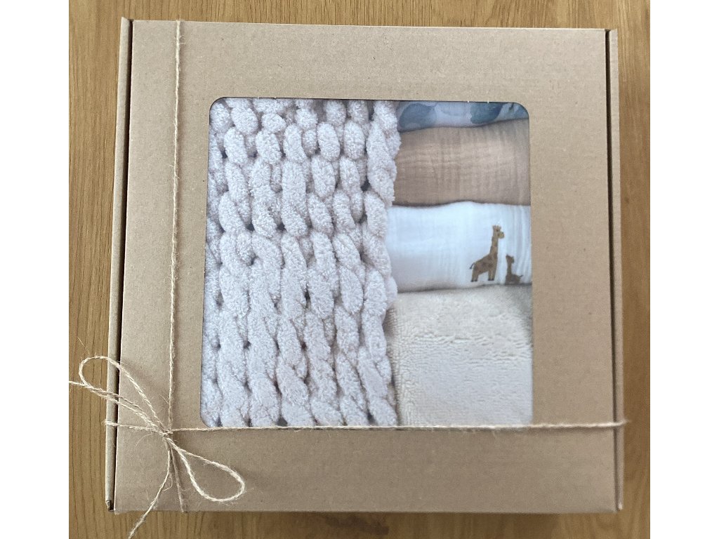 Nabízíme Vám již sestavenou dárkovou krabičku našich mušelínových plen s pletenou dekou a bambusovou osuškou.