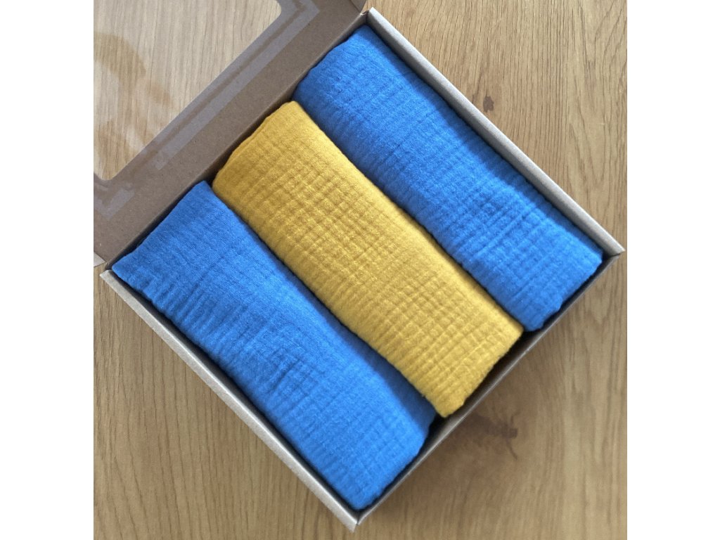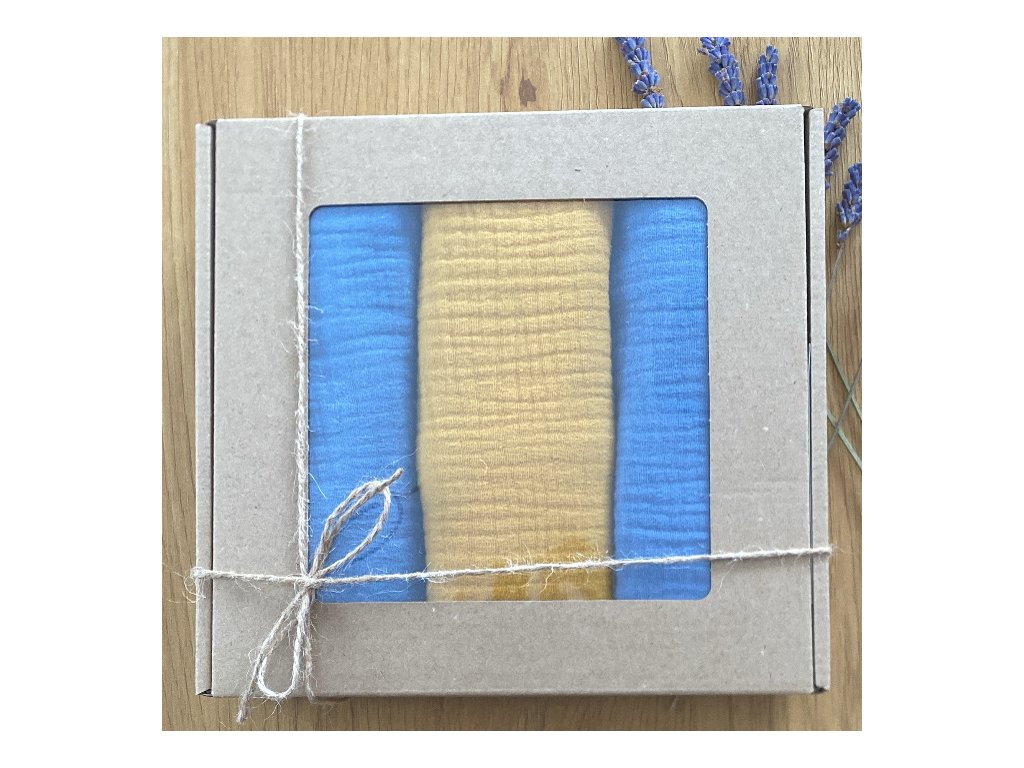 Nabízíme Vám již sestavenou dárkovou krabičku našich utěrek z 3 vrstvého mušelínu ze 100% bavlny s úžasnou savostí.