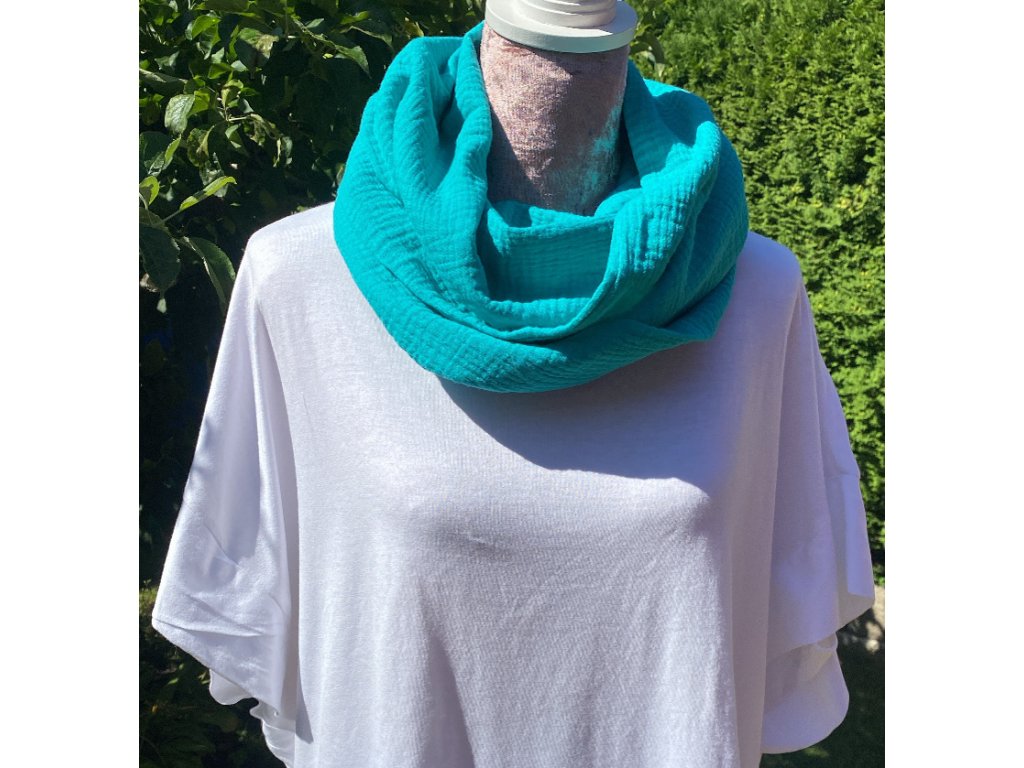 Kruhová šála ušita z mušelínu ze 100% bavlny. Je krásným doplňkem a podtrhne krásu každé ženy.