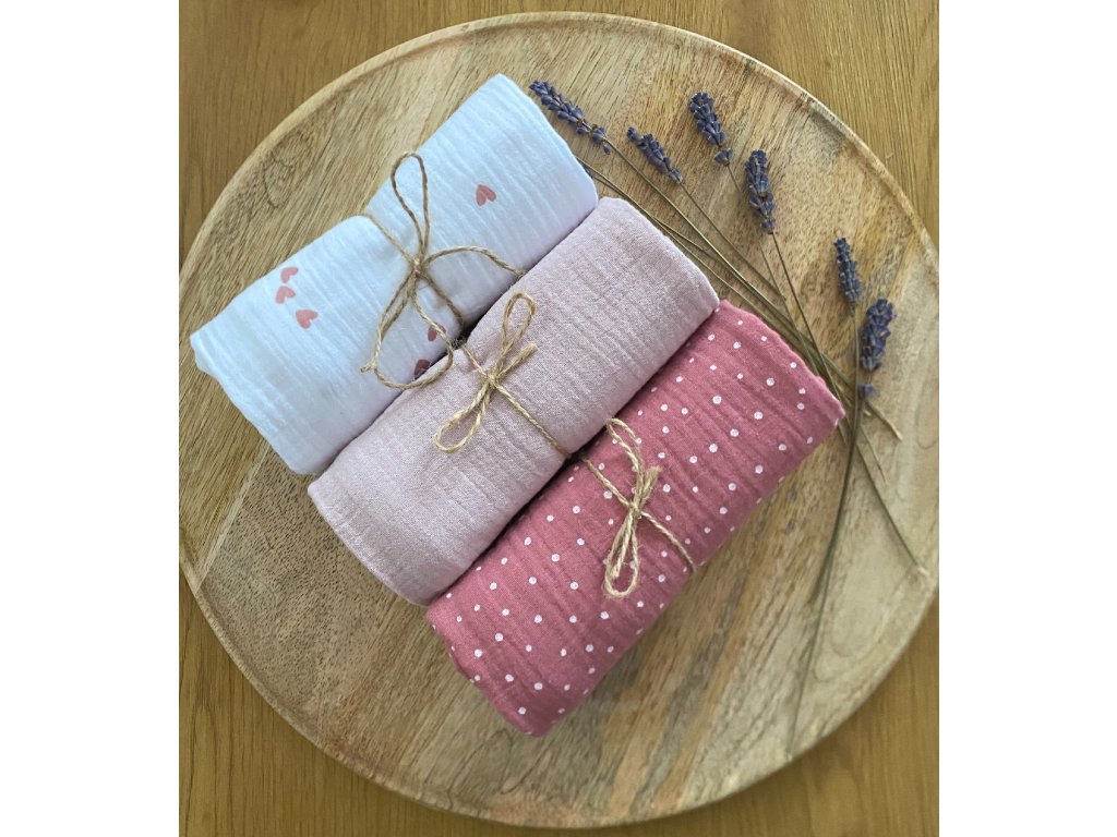Mušelínové pleny 70 x 70 cm: bílá s růžovými srdci, světle starorůžová, růžová s bílým puntíkem.