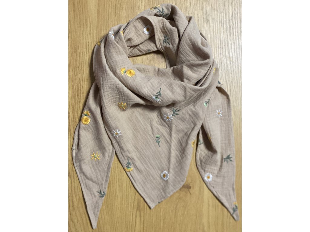 Hnědo- béžový mušelínový vyšívaný šátek.